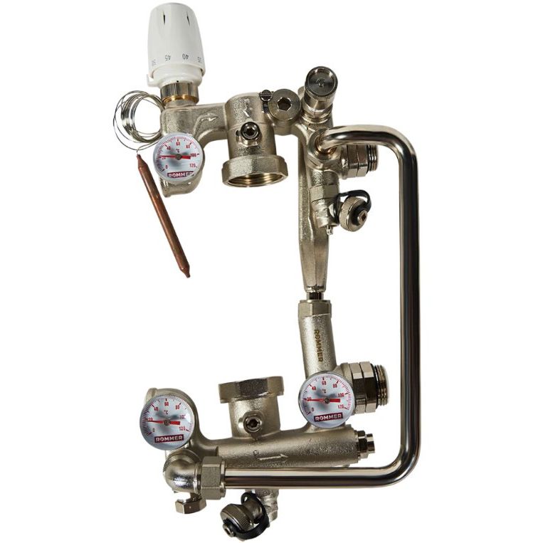 Насосно-смесительный узел ROMMER с термостатической головкой с выносным датчиком — изделие полной заводской готовности. Предназначен для обеспечения циркуляции в системах радиаторного отопления, а также циркуляции и поддержания температуры подающего теплоносителя в пределах 20-60°С в системах поверхностного отопления. Узел применяется в системах встроенного водяного отопления — теплые полы, теплые стены, обогрев теплиц и открытых площадок.
