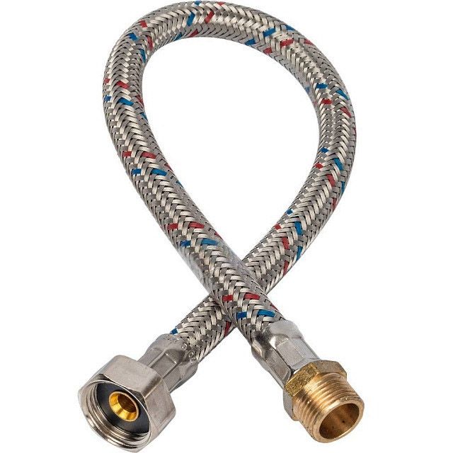 Гибкая подводка представляет собой шланг из нетоксичной резины в оплетке из нержавеющей стали. По концам подводки напрессованы ниппели с наружной резьбой или с накидной гайкой, укомплектованной прокладкой.