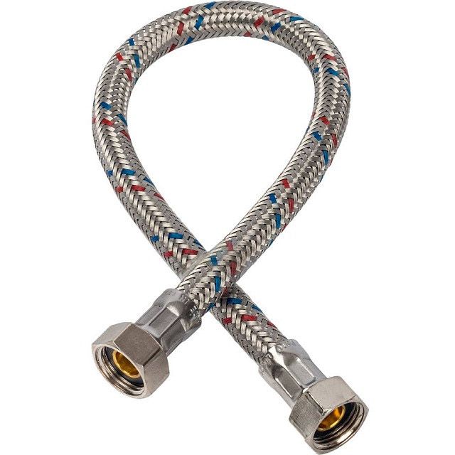 Гибкая подводка представляет собой шланг из нетоксичной резины в оплетке из нержавеющей стали. По концам подводки напрессованы ниппели с наружной резьбой или с накидной гайкой, укомплектованной прокладкой.