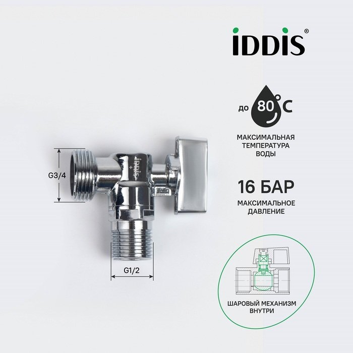Кран угловой Iddis (Иддис), с отражателем, 1/2; 3/4, шаровой, латунь, 910B1P1B4CZ