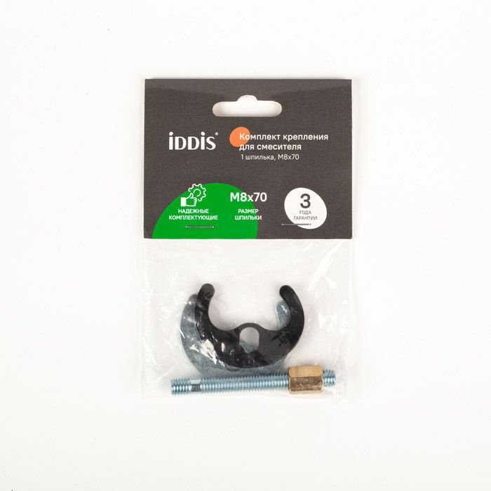Комплект креплений с одной шпилькой размером М8 для вертикальной установки смесителя. Подойдет для установки смесителя для умывальника и кухни (определяется конструктивными особенностями самих смесителей). Крепления изготовлены из прочного металла, стойкого к коррозии. В комплекте одна резьбовая шпилька размером М8 и длиной 70 мм, металлическая крепежная пластина, резиновая прокладка и гайка М8. Гарантия на крепления IDDIS – 3 года.