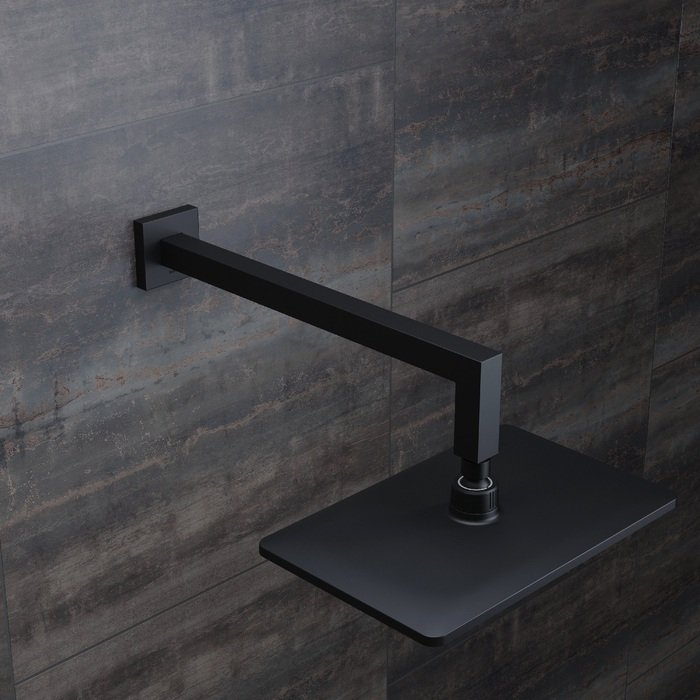 Черный матовый Г-образный настенный кронштейн для верхней душевой лейки. Длина 406 мм.