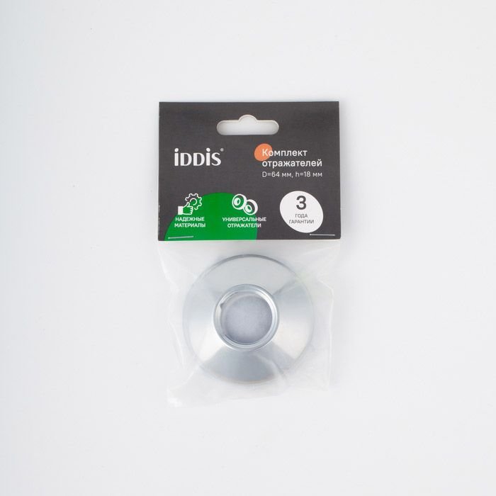 Отражатели для смесителя в базовом дизайне классической конусообразной формы, комплект из 2 шт. Диаметр 64 мм. Закрывают места крепления смесителя на стене в ванной, обеспечивая его аккуратный и эстетичный вид. Универсальное решение для любого смесителя на российском рынке. Изготовлены из прочной нержавеющей стали с хромированным покрытием, устойчивым к появлению царапин и потускнению (при должном уходе). Гарантия на аксессуары к смесителям IDDIS – 3 года.