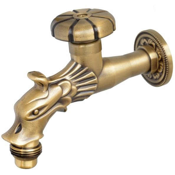 Банные краны с ручкой очень удобны в использовании, они прекрасно вписываются в дизайн бани (хаммам), изящно изогнутая ручка и резьба на корпусе придают атмосферу роскоши, а тёплая бронза создаёт уют. Это дизайнерский банный кран, излив которого выполнен в виде головы дракона, что придаёт ему особую привлекательность и шарм.