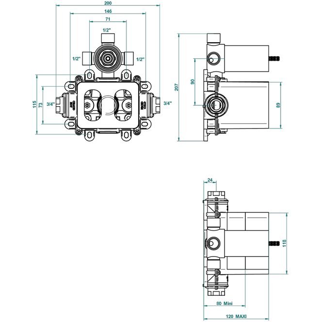 Термостат THG (ТХГ) General items G00 3/4″ - 60 л/мин с восковым картриджем и коробкой для встраивания, для трёх потребителей G00-A00-5600AE