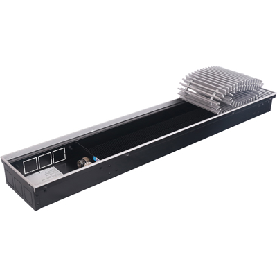 Внутрипольный конвектор работает по принципу свободной конвекции. Воздух помещения опускается через часть решетки в продольный канал между стенкой корпуса и теплообменником и затем, нагреваясь, выходит вверх через другую ее половину.