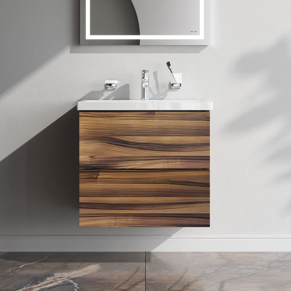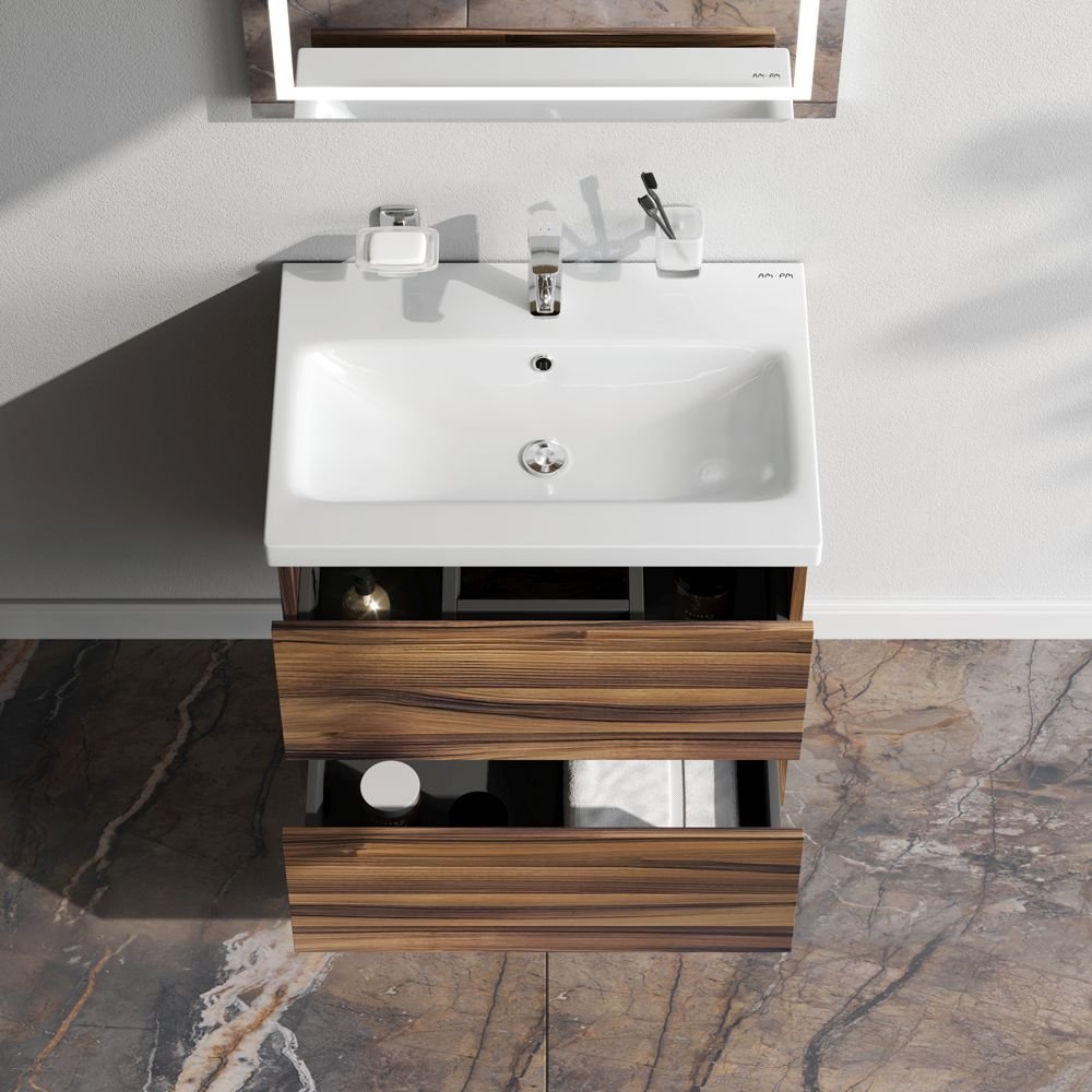Подвесная мебель для ванной из коллекции Gem идеально подойдет тем кто предпочитает минимализм в интерьере и выбирает абсолютный комфорт. Представляем расширение цветовой палитры коллекции Gem в цвете орех. Подвесная база под раковину изготовлена из влагостойкого ЛДСП. Внутреннее пространство двух вместительных ящиков представлено в цвете антрацит с антискользящим эффектом. В верхнем ящике находится удобный органайзер для хранения гигиенических принадлежностей. Благодаря системе отделений органайзера каждый предмет имеет свое место что обеспечивает порядок и удобство при использовании. Такая система хранения позволяет экономить место и помогает поддерживать чистоту ванной комнаты. Фурнитура push-to-open - открытие ящика легким нажатием на фасад. Направляющие скрытого монтажа обеспечивают плавное выдвижение ящиков. Ширина базы под раковину - 60 см.