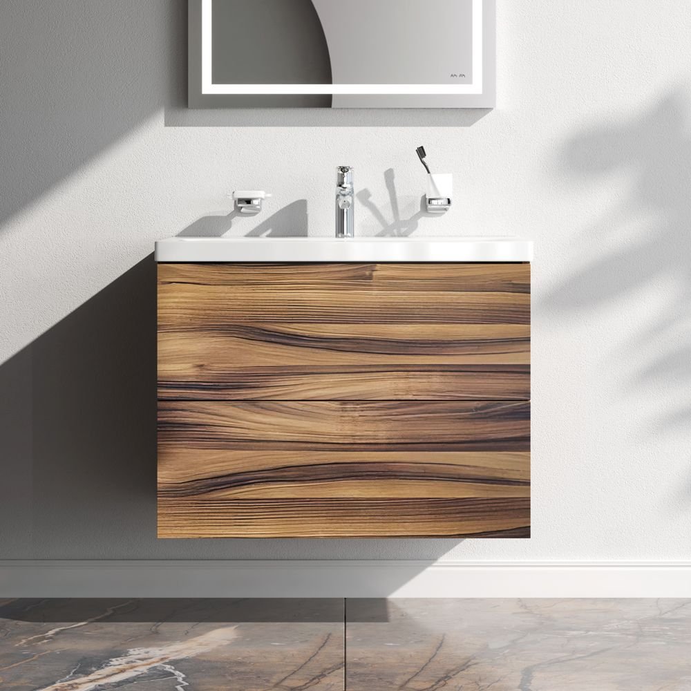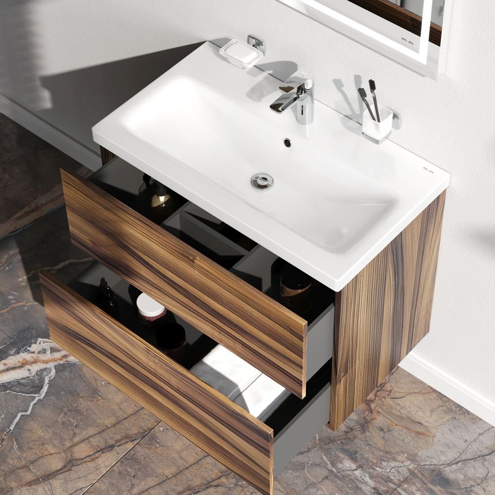 Подвесная мебель для ванной из коллекции Gem идеально подойдет тем кто предпочитает минимализм в интерьере и выбирает абсолютный комфорт. Представляем расширение цветовой палитры коллекции Gem в цвете орех. Подвесная база под раковину изготовлена из влагостойкого ЛДСП. Внутреннее пространство двух вместительных ящиков представлено в цвете антрацит с антискользящим эффектом. В верхнем ящике находится удобный органайзер для хранения гигиенических принадлежностей. Благодаря системе отделений органайзера каждый предмет имеет свое место что обеспечивает порядок и удобство при использовании. Такая система хранения позволяет экономить место и помогает поддерживать чистоту ванной комнаты. Фурнитура push-to-open - открытие ящика легким нажатием на фасад. Направляющие скрытого монтажа обеспечивают плавное выдвижение ящиков. Ширина базы под раковину - 75 см.