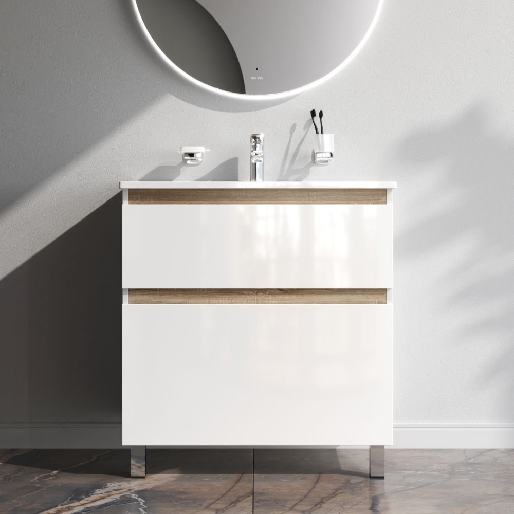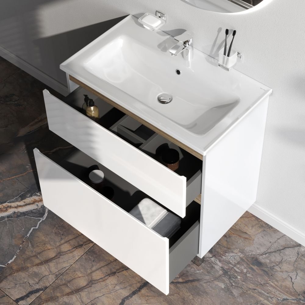 Впервые на рынке – дизайнерская коллекция сантехники которую может позволит себе каждый. Самое эстетичное сочетание цветов и фактур от дизайн-бюро Danelon Meroni (Великобритания & Италия): белые глянцевые фасады дополнены отделкой под светлое дерево. Функциональный органайзер в первом ящике позволит хранить необходимые косметические средства под рукой и в полном порядке. Внутреннее покрытие каждого ящика выполнено в современном цвете Anthracite и имеет противоскользящее покрытие. Встроенная керамическая раковина белоснежного цвета оснащена специальным бортиком для защиты от пролива воды за мебель. Экологически чистые и удивительно долговечные полиакриловые эмали – специальная технология покраски в 7 слоев превосходит технологию нанесения автоэмали у ведущих немецких марок и обеспечивает насыщенный цвет в течение всего срока службы (от 10 лет). База совместима с раковиной: артикул M85AWCC0802WG. Приобретается отдельно.