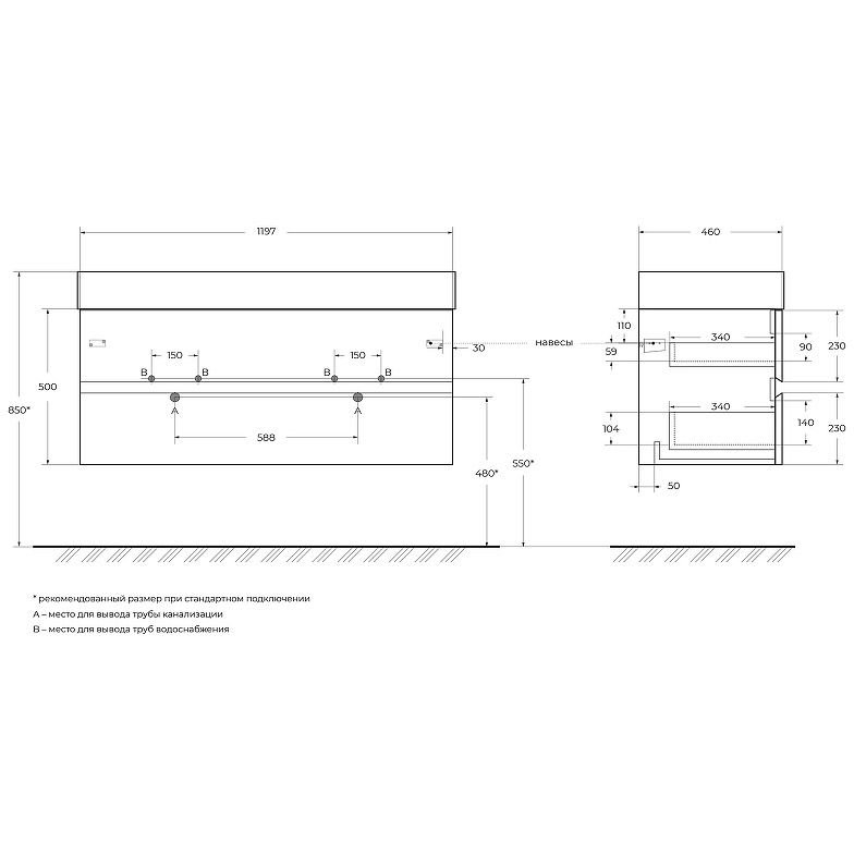 База под раковину подвесная Cezares (Цезарис) Molveno 46 под раковину с двумя чашами с двумя выкатными ящиками Ossido 1200x460x500 MOLVENO 46-120-2C-SO-2-OSS