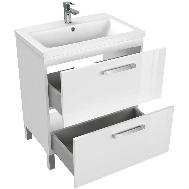 Тумба под раковину MELAR выполнена в нетеряющем актуальности белом цвете. Гладкие глянцевые фасады ящиков дополены хромированными ручками четкой геометричесокй формы. Скрытые направляющие ящиков снабжены доводчиками, что позволяет закрывать ящик мягко и бесшумно. Тумбу можно как подвешивать на стенку, так и устанавливать на ножки, что делает ее универсальным и функциональным решением для любой ванной комнаты.