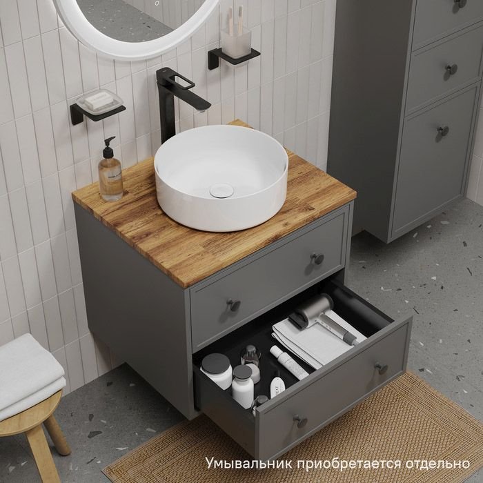 Компактная подвесная тумба Torr трендового темно-серого цвета сочетает в себе узнаваемый стиль и практичность популярного скандинавского дизайна. Ее четкие формы, фасады с декоративной филенкой, круглые ручки смотрятся гармонично и впишутся в любой современный интерьер. Соберите свой комплект со столешницей Torr и любым накладным умывальником (покупаются отдельно). • Два просторных выдвижных ящика закрываются плавно и бесшумно благодаря высококачественным скрытым направляющим с доводчиками Hettich. • Внутренние ящики в графитовом оттенке выглядят стильно. Внутри ящики графитового цвета – стильно и практично. • Покрытие качественной влагостойкой пленкой, разработанной для использования в помещениях с высокой влажностью, сохранит первоначальный вид мебели надолго (при должном уходе). • Надежная фурнитура Hettich рассчитана на 30 000 открываний – это более 10 лет исправной работы. Гарантия на мебель Iddis® – 3 года. (с) Авторский текст, сентябрь 2023 г.
