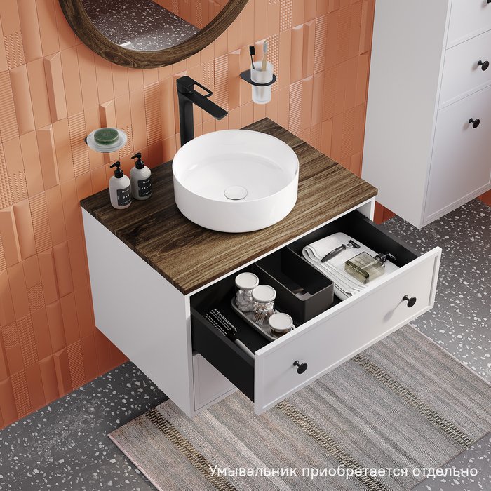 Компактная подвесная тумба Torr классического молочно-белого цвета со столешницей из МДФ в оттенке ореха макадамия. Сочетает в себе узнаваемый стиль и практичность популярного скандинавского дизайна. Ее четкие формы, теплый цвет дерева, фасады с декоративной филенкой, круглые ручки смотрятся гармонично и впишутся в любой современный интерьер. Подойдет любой накладной умывальник, покупается отдельно.