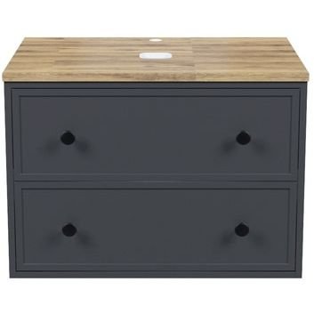 Компактная подвесная тумба Torr трендового темно-серого цвета со столешницей из клееного натурального дуба. Сочетает в себе узнаваемый стиль и практичность популярного скандинавского дизайна. Ее четкие формы, теплый цвет дерева, фасады с декоративной филенкой, круглые ручки смотрятся гармонично и впишутся в любой современный интерьер. Подойдет любой накладной умывальник, покупается отдельно. • Два просторных выдвижных ящика закрываются плавно и бесшумно благодаря высококачественным скрытым направляющим с доводчиками Hettich. Внутри ящики графитового цвета – стильно и практично. • Покрытие качественной влагостойкой пленкой, разработанной для использования в помещениях с высокой влажностью, сохранит первоначальный вид мебели надолго (при должном уходе). • Надежная фурнитура Hettich рассчитана на 30 000 открываний – это более 10 лет исправной работы. Гарантия на мебель IDDIS® – 3 года. (с) Авторский текст, сентябрь 2023 г.