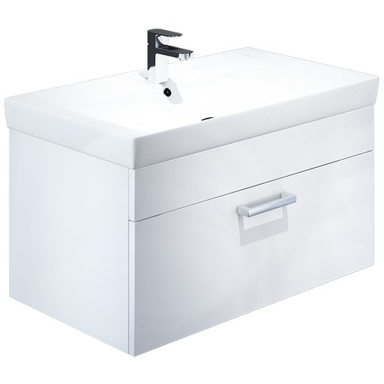 Тумба с умывальником для ванной комнаты, подвесная. Размеры тумбы: 438х789х555 мм (ДхШхВ). Размеры умывальника: 450х800 мм (ДхШ). Фасад ЛДСП 16 мм, эмаль, цвет белый глянец. Боковины ЛДСП 16 мм, эмаль, цвет белый. Выдвижной ящик с механизмом плавного доведения, внутренний ящик для мелочей без доводчика. Упаковка: картон, пленка, пенопластовые уголки.
