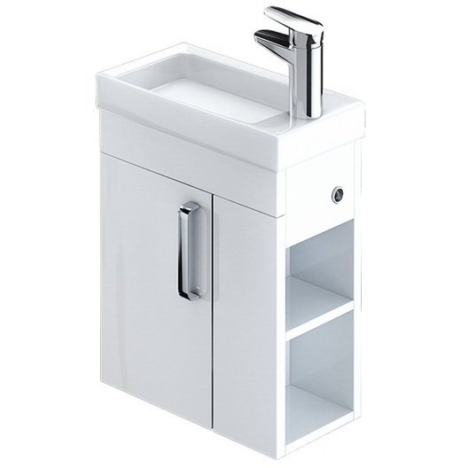 Тумба с умывальником для ванной комнаты, подвесная. Размеры тумбы без умывальника: 213х390х600 мм (ДхШхВ). Размеры умывальника: 220х400 мм (ДхШ). Фасад ЛДСП 16 мм в эмали, боковины ЛДСП белый глянец. Одна распашная дверца, фальш-фасад, 2 открытые полки с правой стороны. Сбоку тумбы - отверстие для гигиенического душа с пластиковым кольцом. Петли с доводчиком. Упаковка: картон, пленка, пенопластовые уголки.