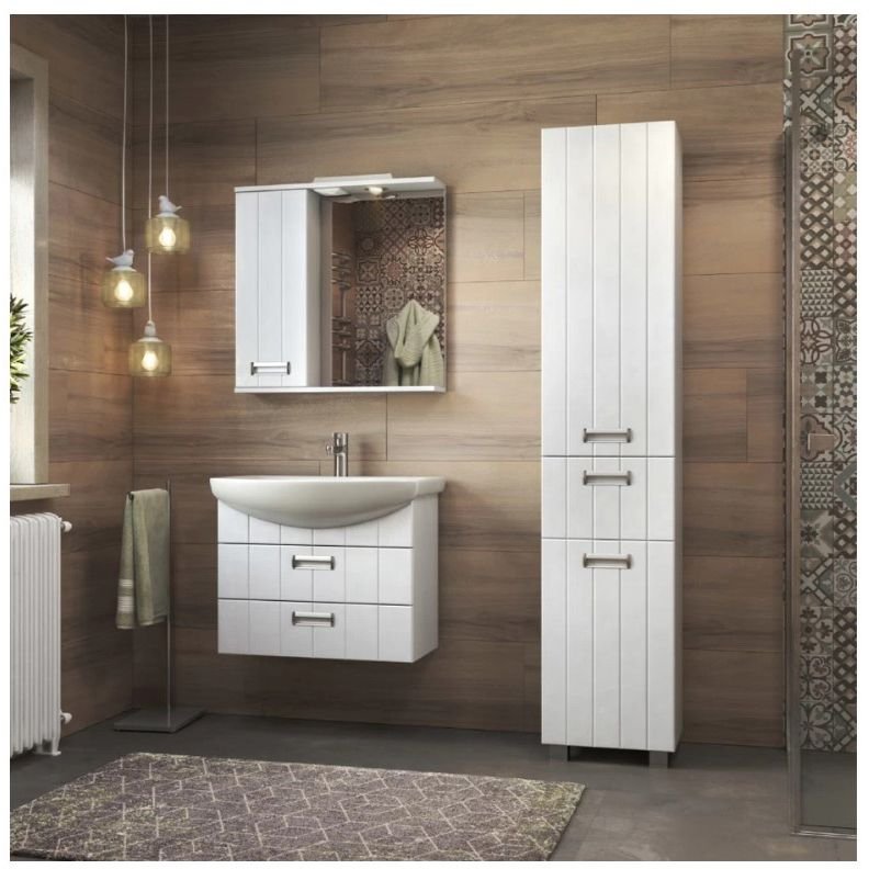 Тумба выполнена в современном стиле с глянцевой ПВХ пленкой для надежной защиты от воды. Фурнитура цвета хром дополняет общий дизайн изделия. Предназначена для использования в ванных комнатах с повышенной влажностью.