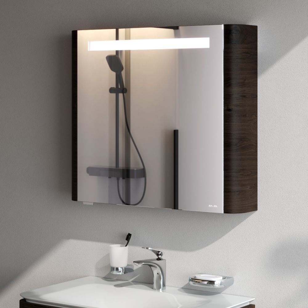 Зеркало Am.Pm (Ам.Пм) Sensation, зеркальный шкаф, левый, 80 см с подсветкой, табачный дуб, M30MCL0801TF
