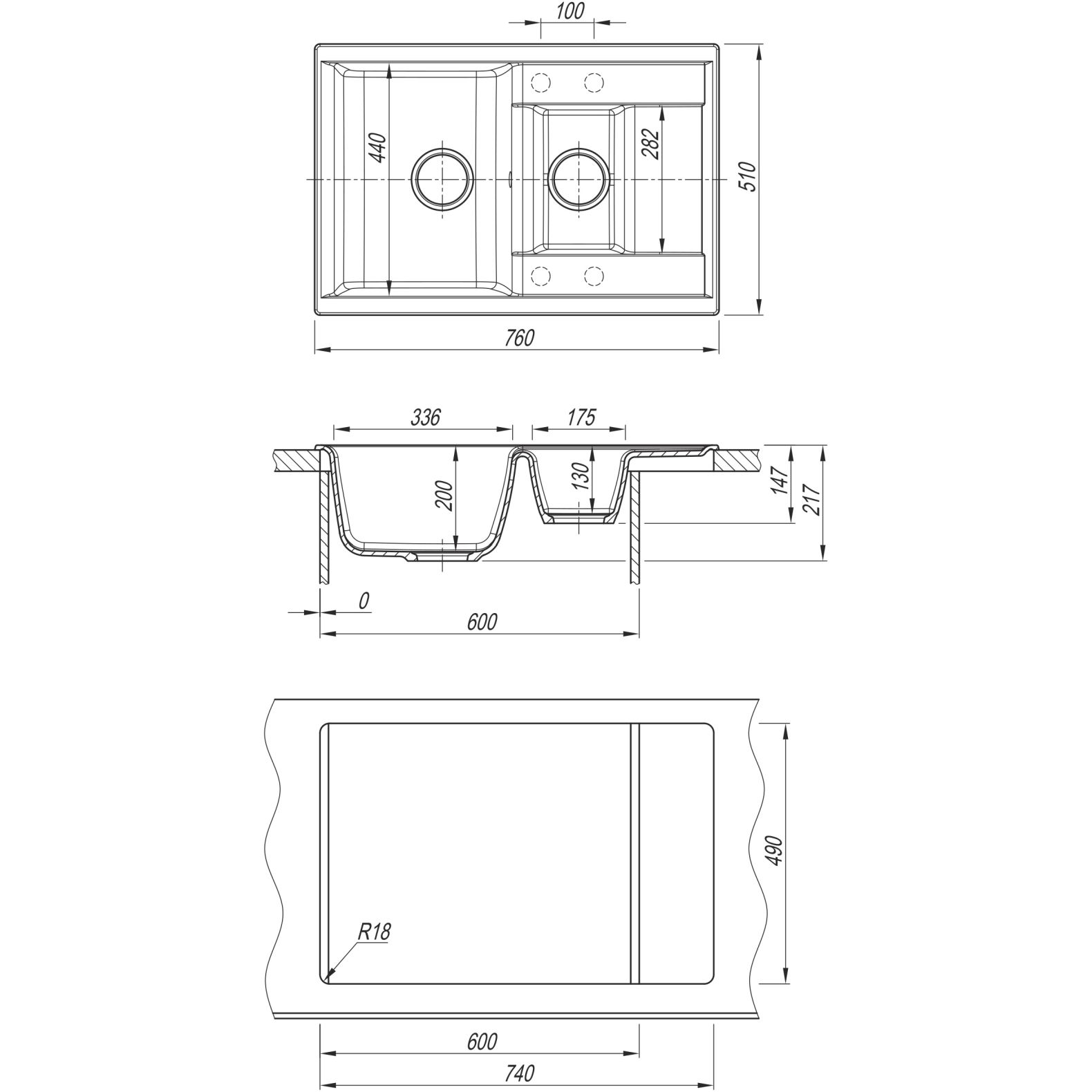 врез под столешницу:740 х 490 мм p>