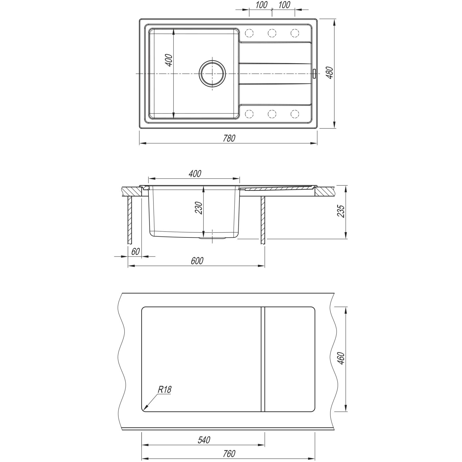 Кухонная мойка КОМБИ 780 - Материал столешницы мойки - кварцевый композит; Материал чаши мойки - нержавеющая сталь марки AISI 304, толщина 1 мм. Габариты изделия (ДхГхВ): 780х480х235 мм В комплект входит отводная арматура с выпуском 3 ½ ” (D=90 мм) и переливом, набор крепежей, трафарет; Модель оборачиваемая.