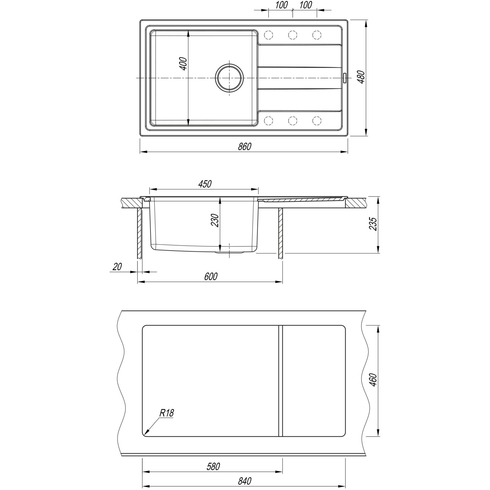 Кухонная мойка КОМБИ 860 - Материал столешницы мойки - кварцевый композит; Материал чаши мойки - нержавеющая сталь марки AISI 304, толщина 1 мм. Габариты изделия (ДхГхВ): 860х480х235 мм В комплект входит отводная арматура с выпуском 3 ½ ” (D=90 мм) и переливом, набор крепежей, трафарет; Модель оборачиваемая.