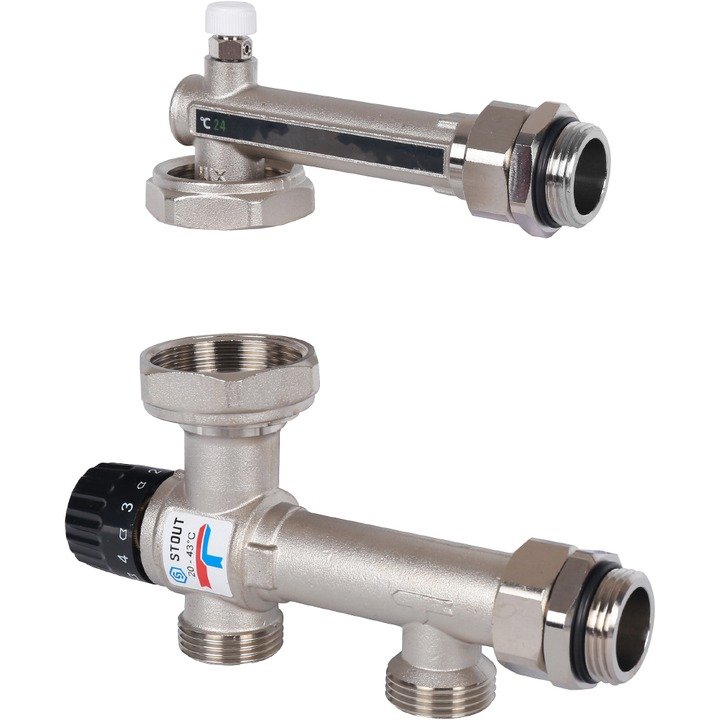 Насосно-смесительный узел с 3-х ходовым термостатическим клапаном STOUT - изделие полной заводской готовности. Предназначен для обеспечения циркуляции и поддержания температуры подающего теплоносителя на постоянном уровне 20-55 оС в низкотемпературных системах отопления типа теплый пол.