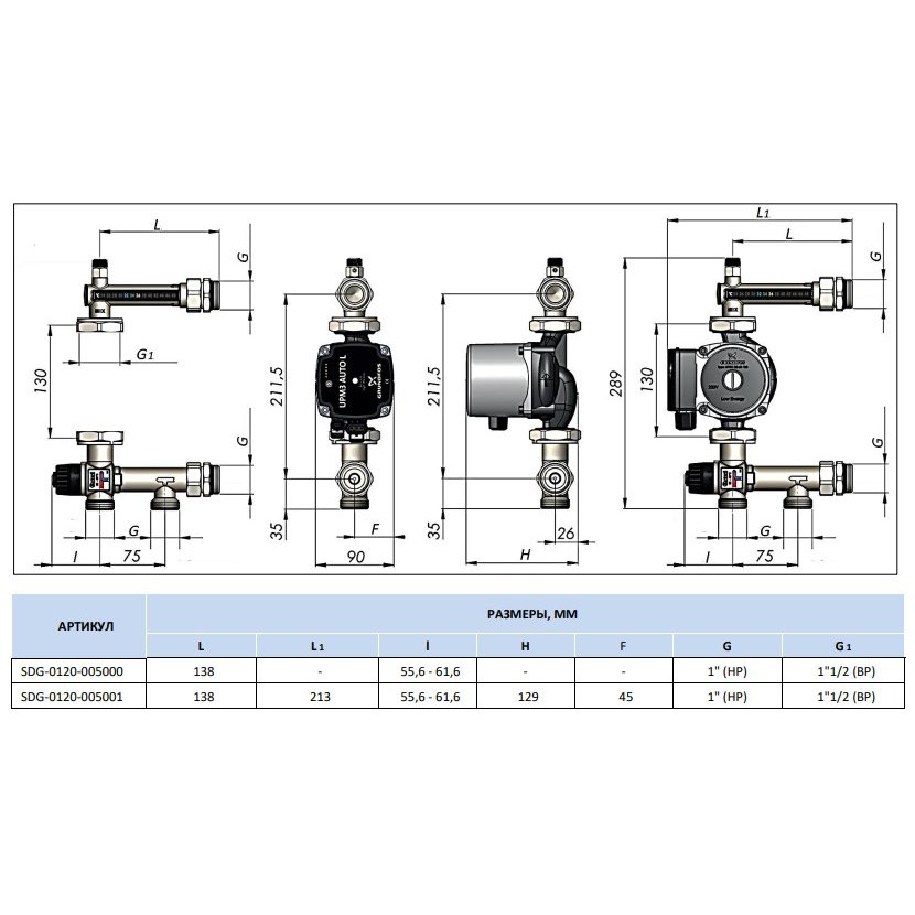 Узел может поставляться как в комплекте с насосом Grundfos, так и без него. Во втором случае возможно использование любого другого насоса с соответствующими характеристиками, строительной длиной и наружной резьбой под гайки для присоединения насоса к деталям узла.