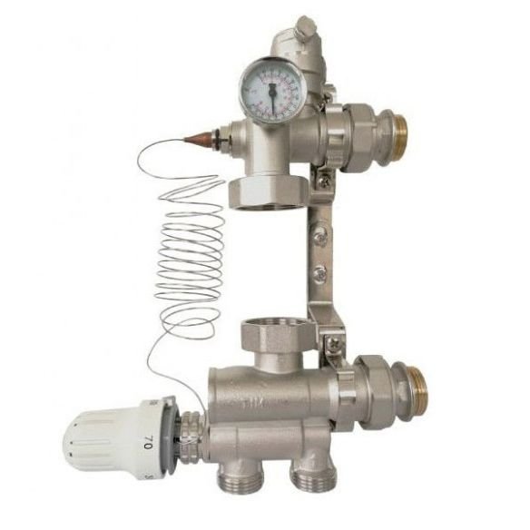 В системе напольного отопления насосно-смесительный узел обеспечивает приготовление теплоносителя с температурой, пониженной до заданного значения (в диапазоне от 20 до 60 °С), а также его циркуляцию в контурах теплого пола. Узел позволяет осуществлять гидравлическую увязку первичного и вторичного контуров, регулировать температуру и расход теплоносителя в зависимости от требований пользователя. Узел оснащен всей необходимой арматурой и контрольно-измерительными приборами и может размещаться в коллекторном шкафу. Корпус и детали узла выполнены литьем из качественной сантехнической латуни и никелированы. Материал уплотнений – эластомер EPDM. Узел рассчитан на работу в системах с максимальной температурой теплоносителя в первичном контуре 90 °С и давлением до 10 бар. Циркуляционный насос приобретается отдельно.