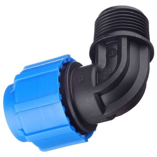 Угольник с трубной резьбой. Предназначен, для возможности легкого перехода со стального трубопровода на трубопровод из ПНД труб под прямым углом. Угольник компрессионный имеет в своем ассортименте очень богатый выбор размеров резьбы, которым не может похвастаться ни один отечественный производитель компрессионных фитингов.