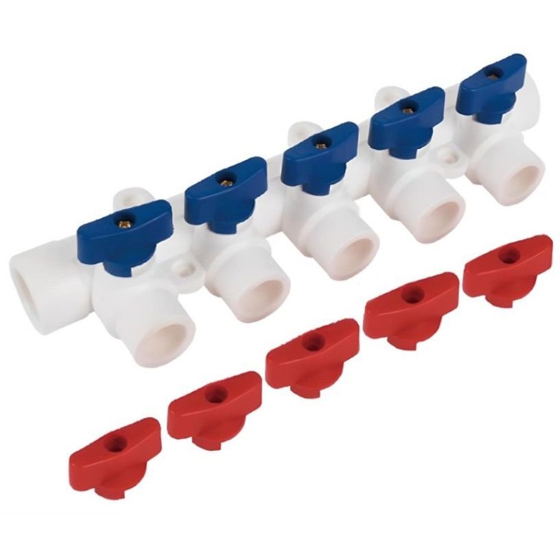 Регулирующие коллекторы с запорно-регулирующими вентилями позволяют контролировать распределение и напор воды с высокой точностью различных контуров (баня, санузел, гостиная, кухня и т.д.), а также сделать работу этих контуров автономной.Коллектор с кранами полипропиленовый 40х20х5 выходов VIEIR ручки красные и синие предназначен для распределения потоков в системах отопления, водоснабжения и различных технологических установках, смонтированных с применением полипропиленовых трубопроводных систем. Коллекторы оснащены встроенными отсечными (шаровыми) кранами на отводах. Условный диаметр корпуса – 40, присоединяемых труб – 20 мм. Материал - полипропилен.