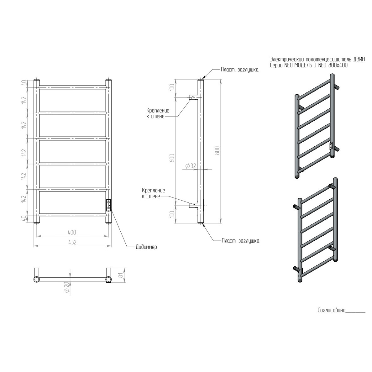 Полотенцесушитель электрический Двин (Dveen) J neo 80х40 см, без полки, К диммер графит