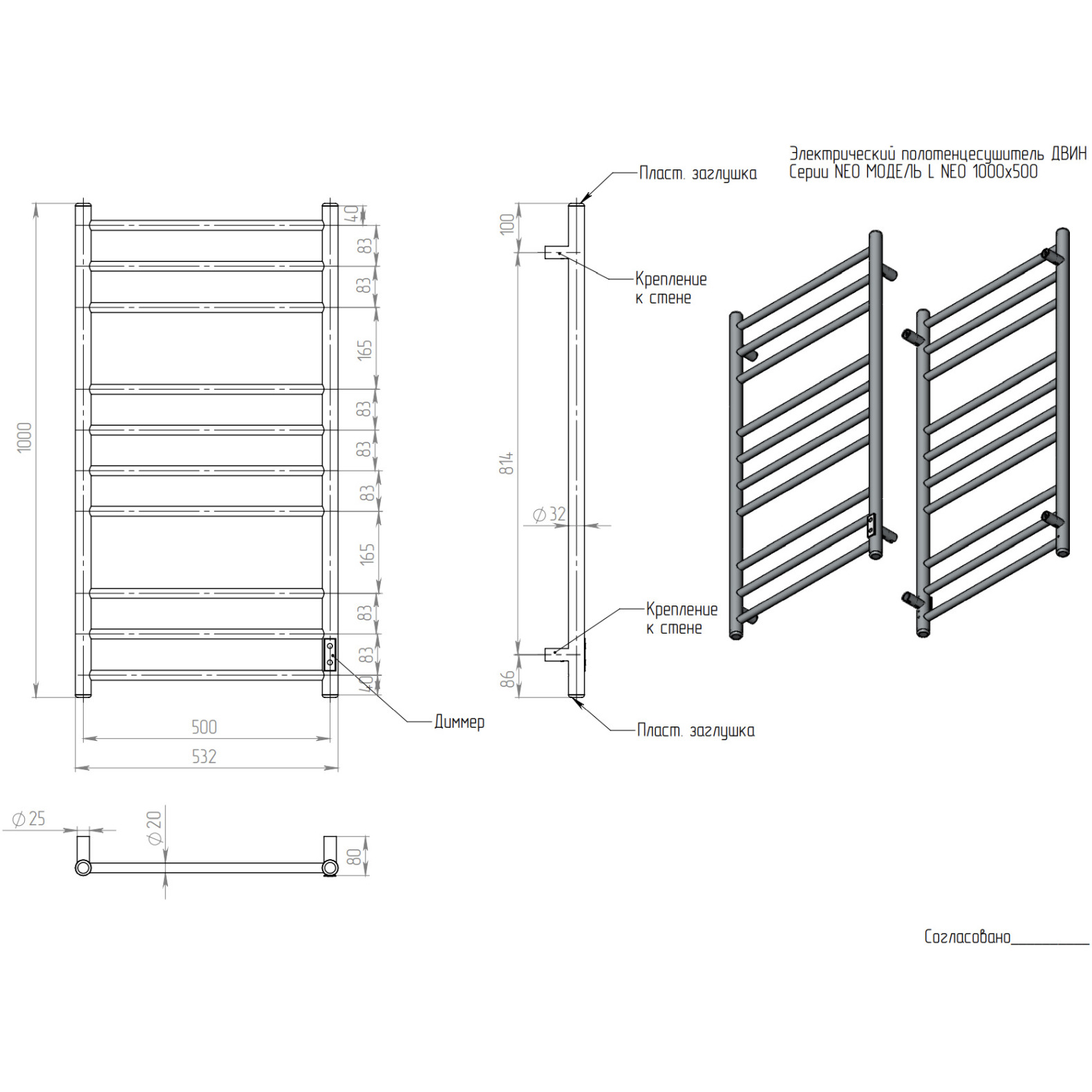 Полотенцесушитель электрический Двин (Dveen) L neo 100х50 см, без полки, К диммер полированный хром