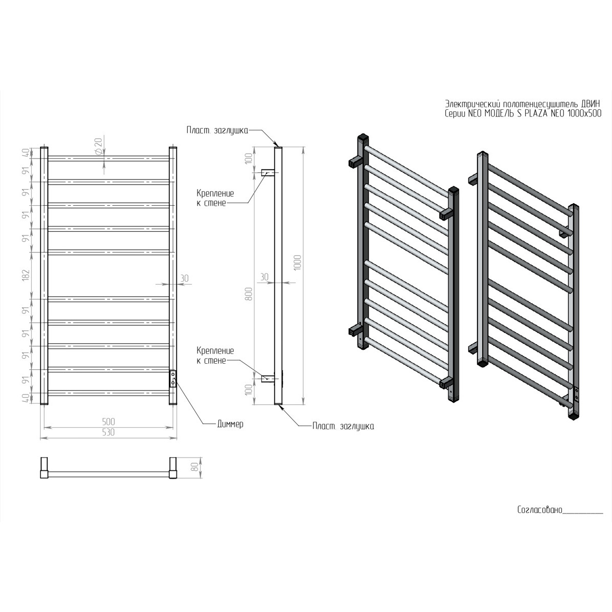 Полотенцесушитель электрический Двин (Dveen) S plaza neo 100х50 см, без полки, К диммер, квадрат черный матовый