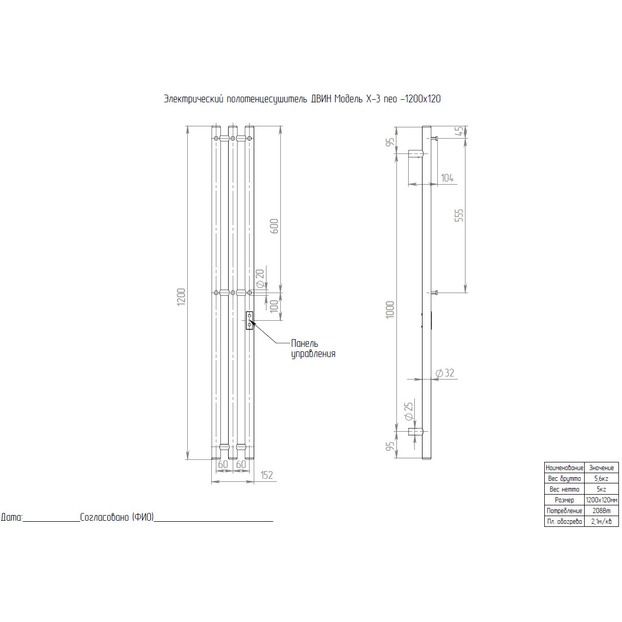 Полотенцесушитель электрический Двин (Dveen) X-3 neo 120x12 см, без полки, К диммер черный матовый