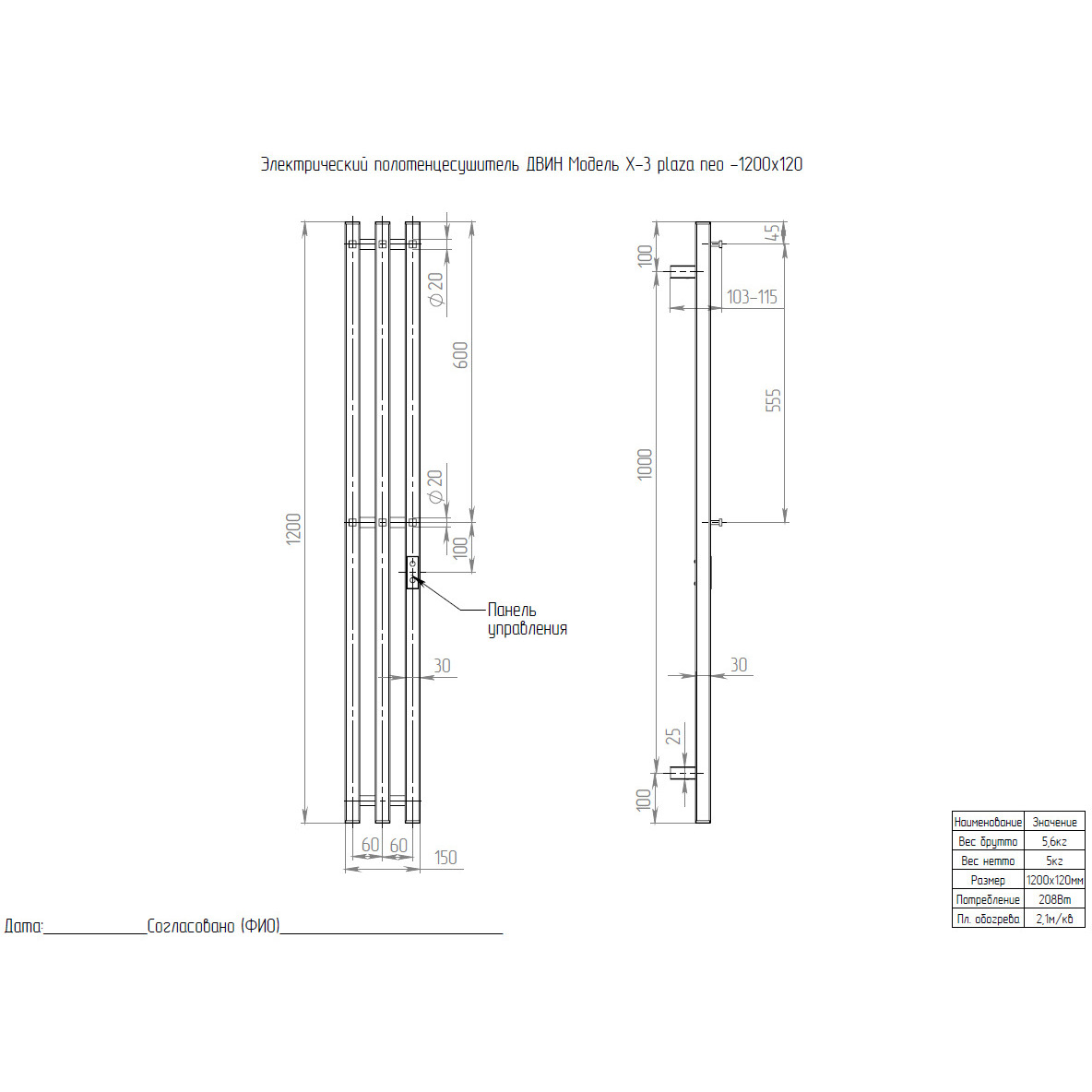 Полотенцесушитель электрический Двин (Dveen) X-3 plaza neo 120x12 см, без полки, К диммер, квадрат белый
