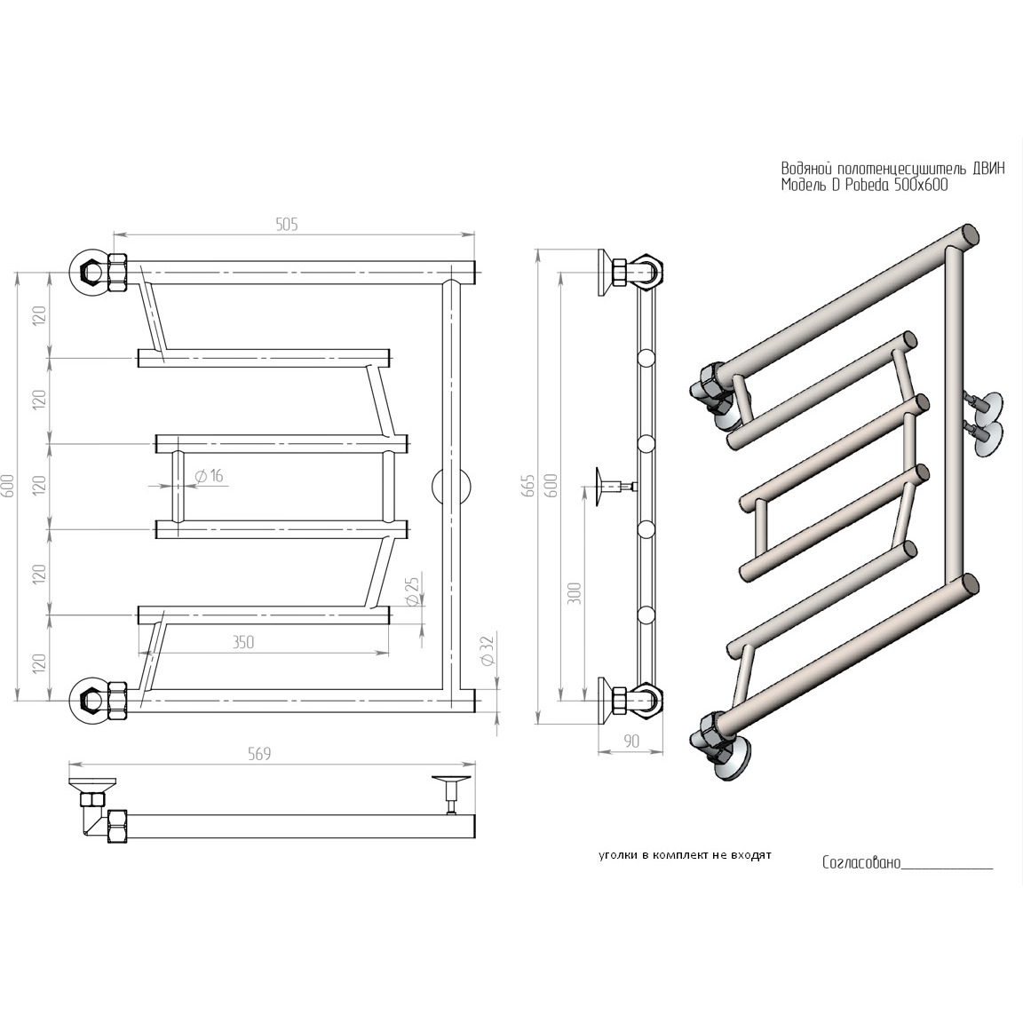 Полотенцесушитель водяной Двин (Dveen) D Pobeda 50х60 см, без полки, 1х3/4/1х1/2″ К0 полированный хром