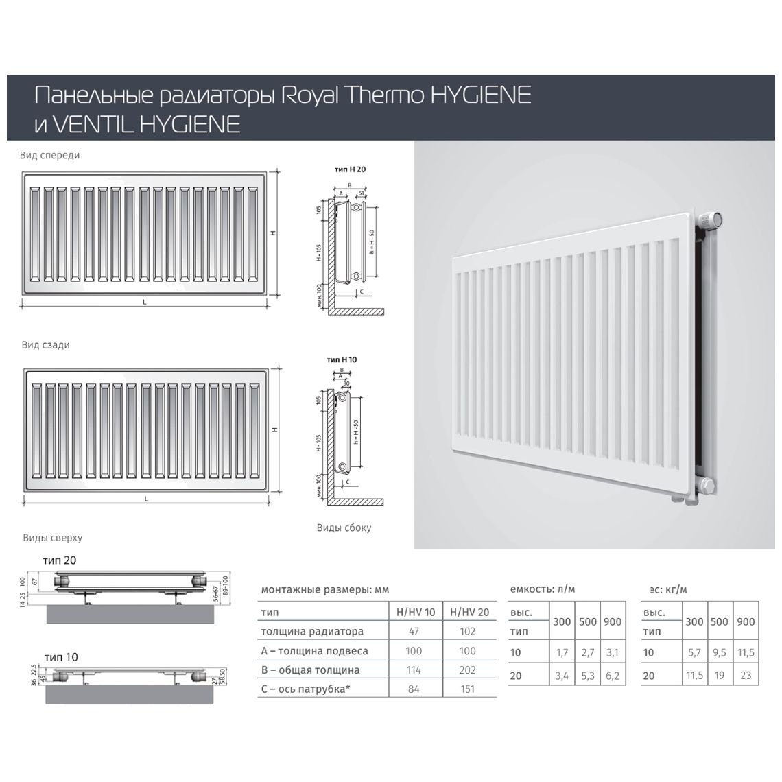Радиатор панельный Royal Thermo (Роял Термо) с боковой подводкой Hygiene 500х900 мм (H10-500-900/9016)