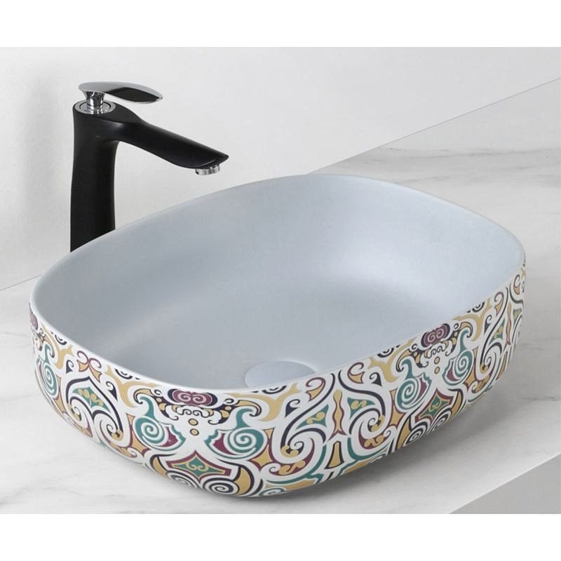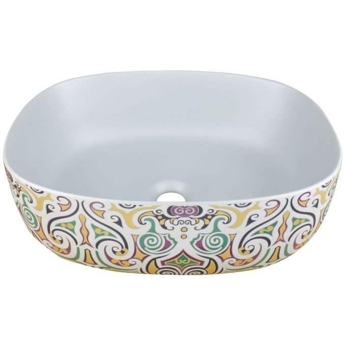 4035 Накладная раковина MURANO 455х340х160 размерами ширина: 455мм, глубина 340мм, высота 160 мм. Секрет успеха ванной комнаты с этой раковиной— в комбинации цвета и яркого орнамента. Раковина с узорами, выполненными в духе образцов XVIII века и жемчужного цвета дном, смотрится весьма органично в таком неожиданном исполнении.