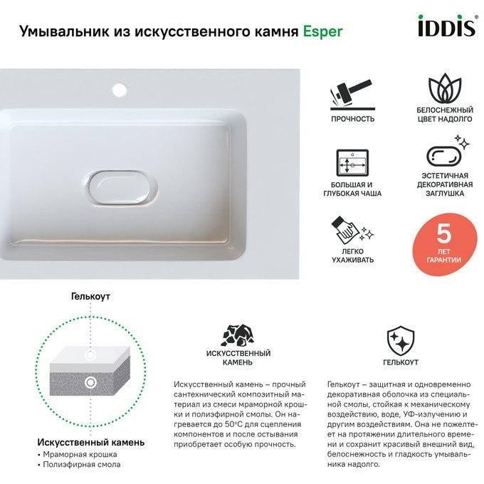 Умывальник IDDIS в стильном современном дизайне. Модель большого размера подходит к подвесной тумбе Esper (арт. ESP10W0i95). Большая чаша умывальника удобна и для гигиенических, и для хозяйственных нужд. В комплекте декоративная накладка на слив. Умывальник IDDIS из литьевого искусственного камня обладает повышенной механической прочностью и долговечностью. Его правильная геометрия обеспечивает идеальное прилегание к тумбе и легкий сток воды с естественной защитой от разбрызгивания. Покрытие умывальника IDDIS из гелькоута обладает стойкостью к загрязнению благодаря отсутствию микропор. Гелькоут отличается глянцевым блеском и совершенно гладкой поверхностью, что обеспечивает красивый внешний вид умывальника. Гарантия на умывальники IDDIS – 5 лет. (с)