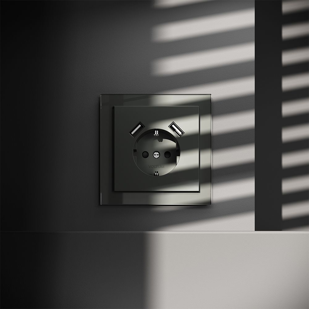 Розетка встраиваемая Voltum (Вольтум) S70 с заземлением и защитными шторками, 16А, с USB, A+A, (титан) VLS040406