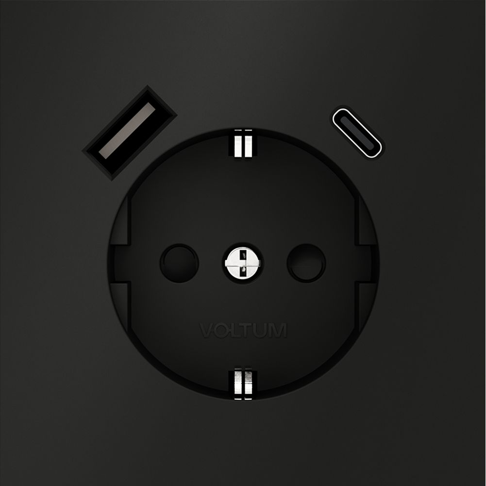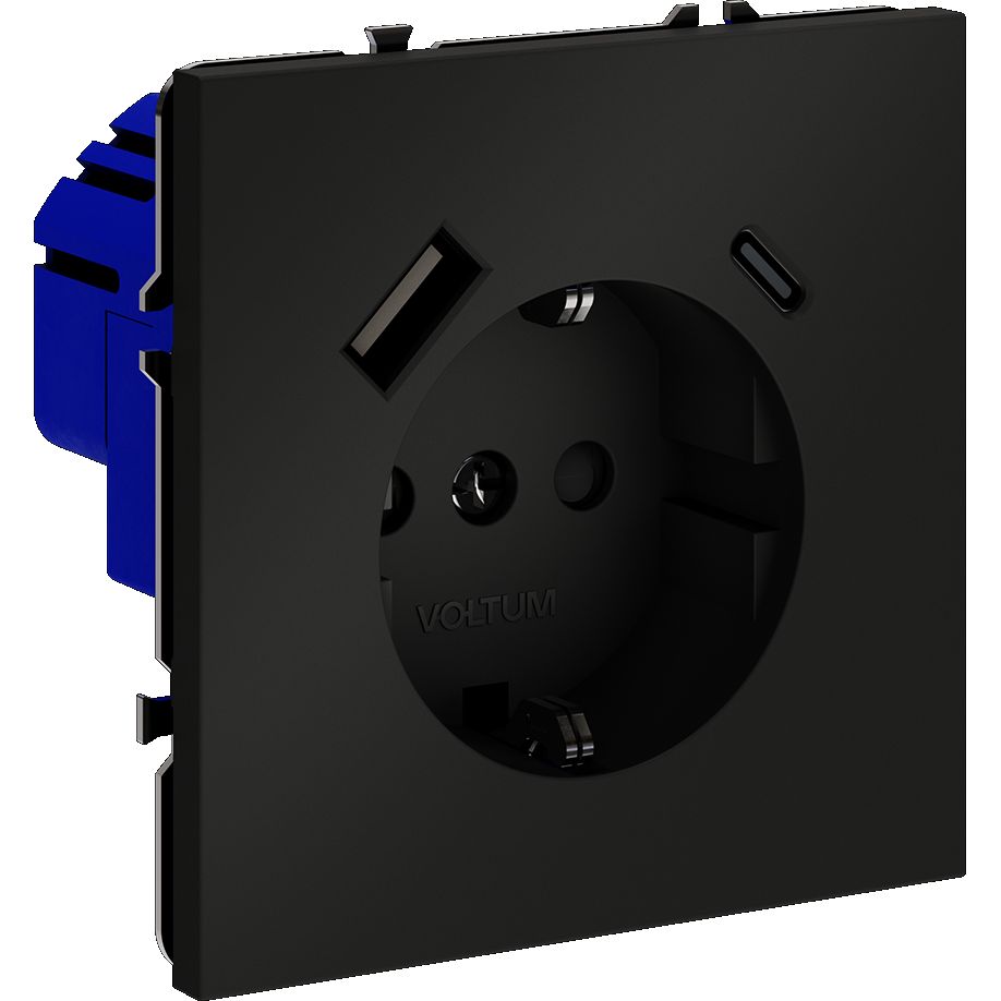 Розетка встраиваемая Voltum (Вольтум) S70 с заземлением и защитными шторками, 16А, с USB, A+С, (черный матовый VLS040508