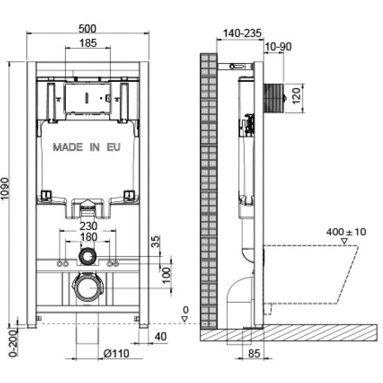 Совместима с моделями подвесных унитазов с расстоянием между креплениями 180 мм и 230мм