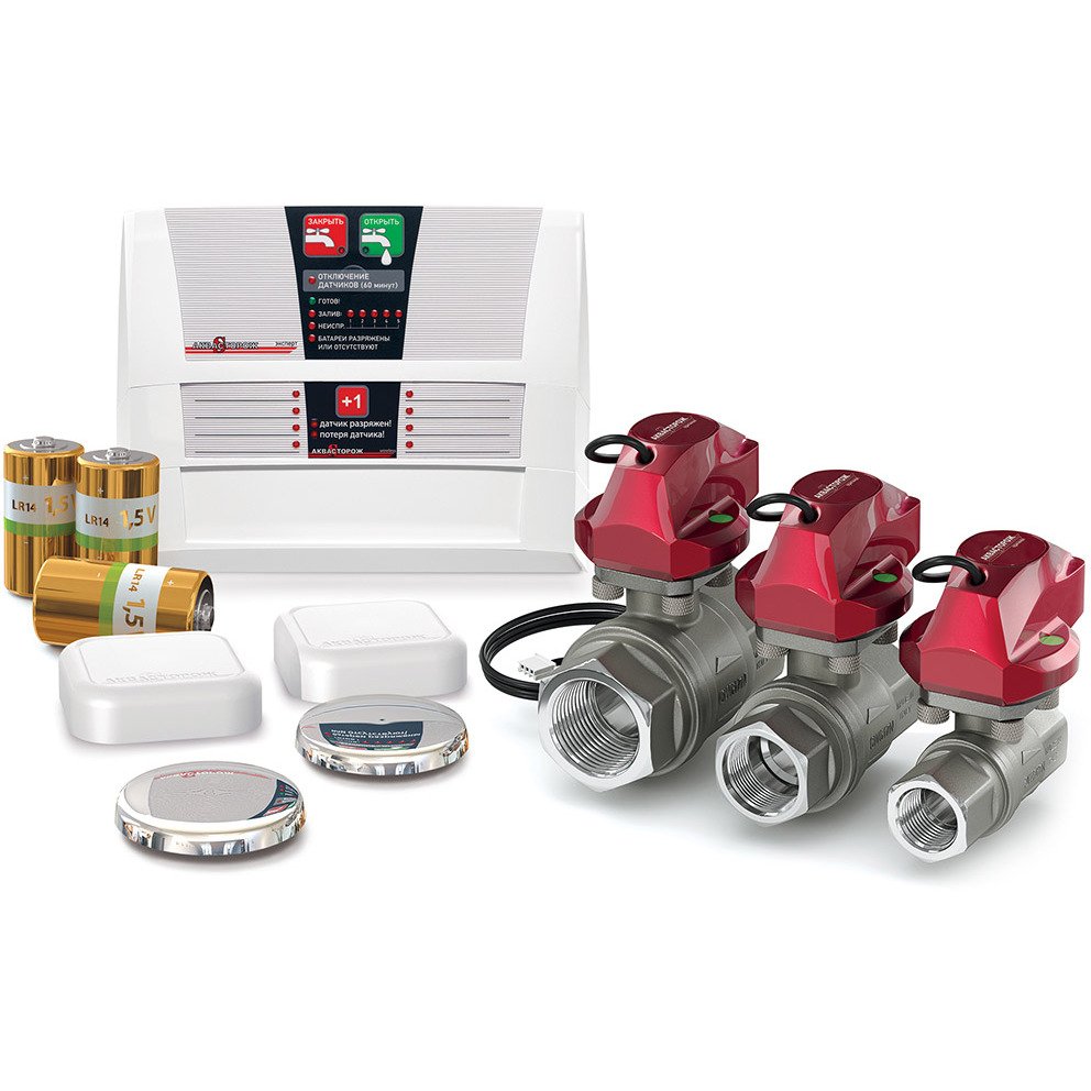 Электронно-механическая система Аквасторож cостоит из трех обязательных компонентов – контроллера, шарового электрокрана и датчика протечки Аквасторож, предназначена для информирования пользователя о протечке воды и минимизации последствий аварии в системе водоснабжения.Область применения: защита имущества и ответственности владельцев квартир, коттеджей, гостиниц, офисов и прочих объектов недвижимости. Проводной набор на базе контроллера Эксперт. Идеально подходит для установки в квартире. Аквасторож Эксперт – новое слово в системах защиты при потопе. В системе Эксперт реализована технология Умные краны, которая позволяет анализировать и контролировать обрыв цепи подключенных кранов и положение шаровой заслонки. Также система Эксперт обладает функцией контроля обрыва цепи датчиков. 1 кран 1 (25 мм) контроллер Эксперт PRO 4 проводных датчика Эксперт провода 4 м, 4 м, 10 м, 10 м блок питания 5 В батареи R14 (тип С) – 3 шт. крепеж