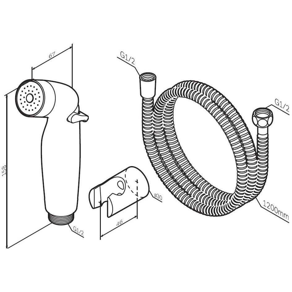 Гигиеническая лейка в комплекте с шланговым подсоединением-держателем и шлангом. Шарнирное соединение защищает душевой шланг от перекручивания. Гибкая конструкция защищенная от изломов и повреждений. Удобная для комфортного использования длина шланга 1200 мм.