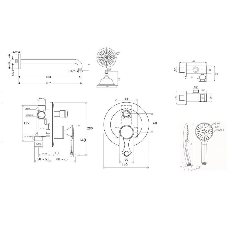 Комплектация:Встраиваемый смеситель для душа, верхний душ, ручной душ, шланг, крепления, излив p>