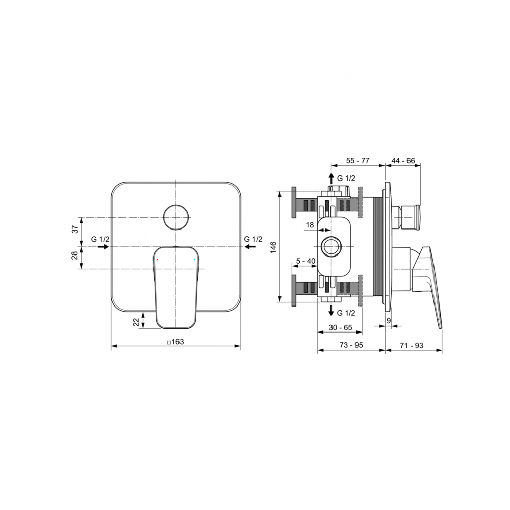 CERAPLAN Встраиваемый смеситель для ванны/душа, комплект №2 (функциональная + декоративная части), картридж 47 мм с функцией HWTC (ограничение максимальной температуры горячей воды), без душевого гарнитура, хромированная пластиковая накладка, металлическая рукоятка с индикаторами горячей / холодной воды, автоматическое переключение, для монтажа с комплектом №1 A1000NU, соответствие EN817