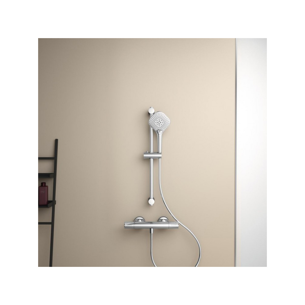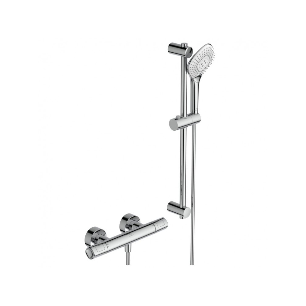 Ceratherm T100 Настенный термостатический смеситель для душа, скрытый монтаж на эксцентриках, термостатический картридж IS, новая технология, затворы на керамических дисках G1/2 180˚, технология "Cool body" ("Холодный корпус"), металлические рукоятки с ограничителями температуры (40ºC) и потока воды (50%), встроенный обратный клапан, с душевым гарнитуром (3-функциональная душевая лейка Idealrain Evo Jet Diamond 135 мм с ограничением потока 8 л/мин., шланг 1750 мм Idealflex, штанга 600 мм с регулируемыми кронштейнами)