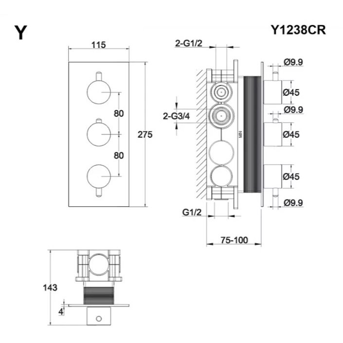 Смеситель Whitecross Y chrome для душа, термостатический, на 3 потребителя, цвет хром, Y1238CR