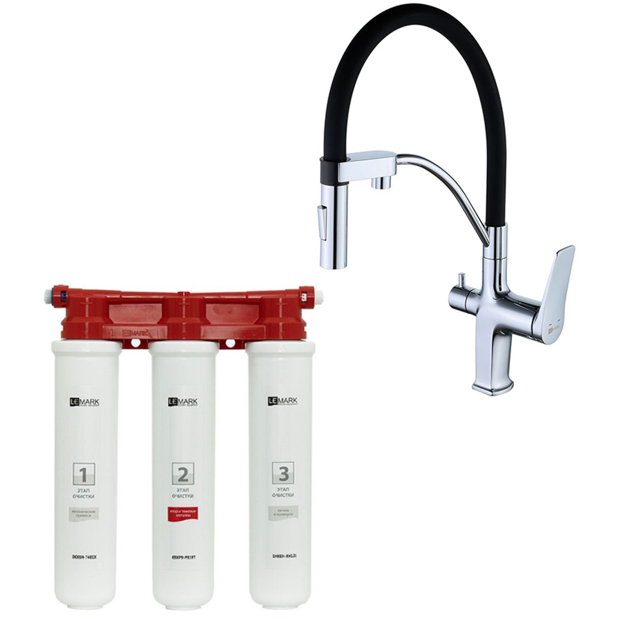 Комплект Lemark (Лемарк) смеситель LM3074C для кухни с гибким изливом + Фильтр BASIC для очистки воды от хлора и вредных примесей (LM3074C085) Черный,хром