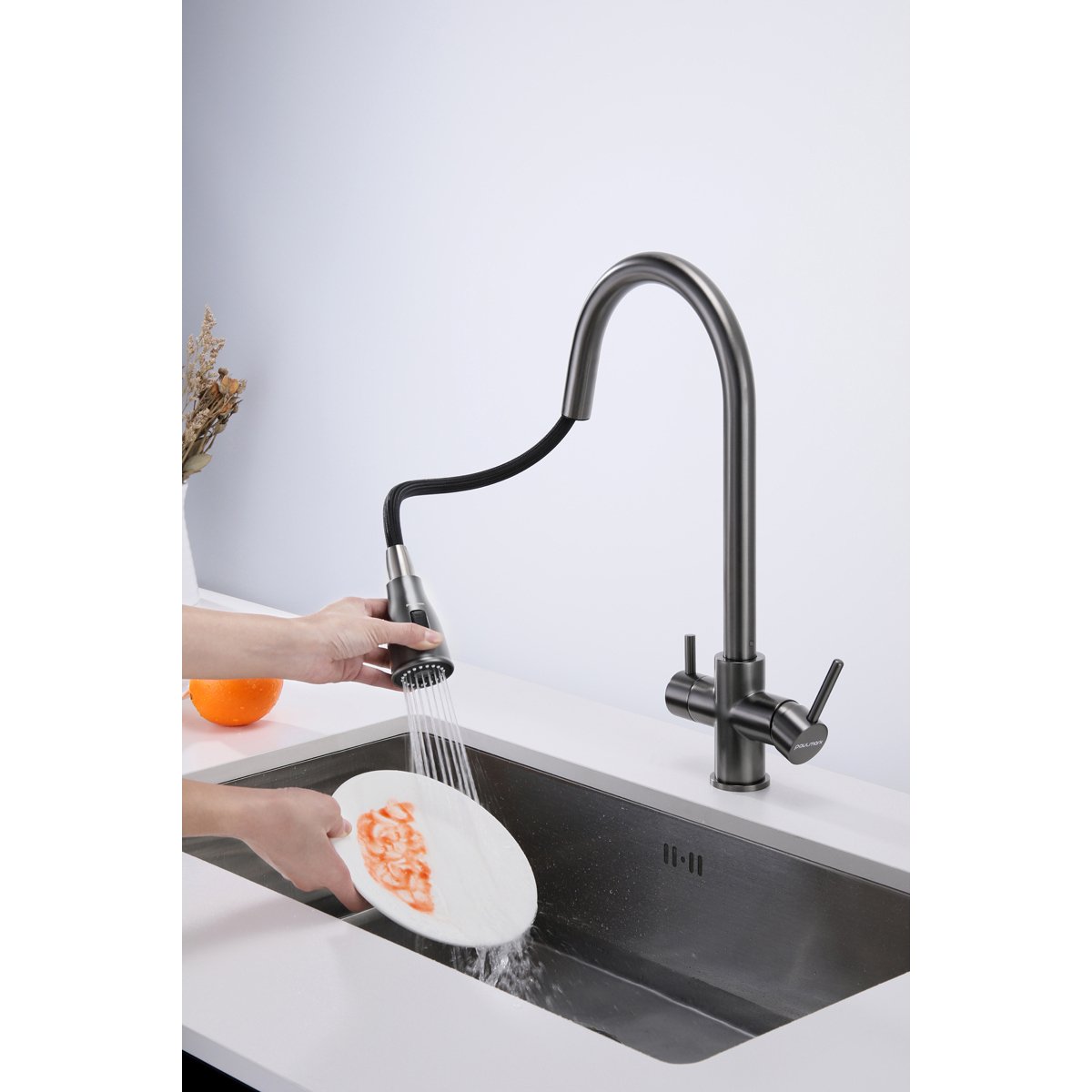 Доставка Смеситель для кухни Paulmark (Паульмарк) под фильтр с выдвижным шлангом Lange вороненая сталь La214212-GM из Москва в районы и города ЮВАО, ЮЗАО, ЮАО, Новомосковский АО, Одинцово, Подольск, Щербинка, Троицк, Строительный рынок Славянский мир, 41-й км МКАД, бывшая Мельница, Красногорск, Домодедово, Тёплый стан, Коммунарка, Мосрентген, Видное, Мамыри, Краснознаменск